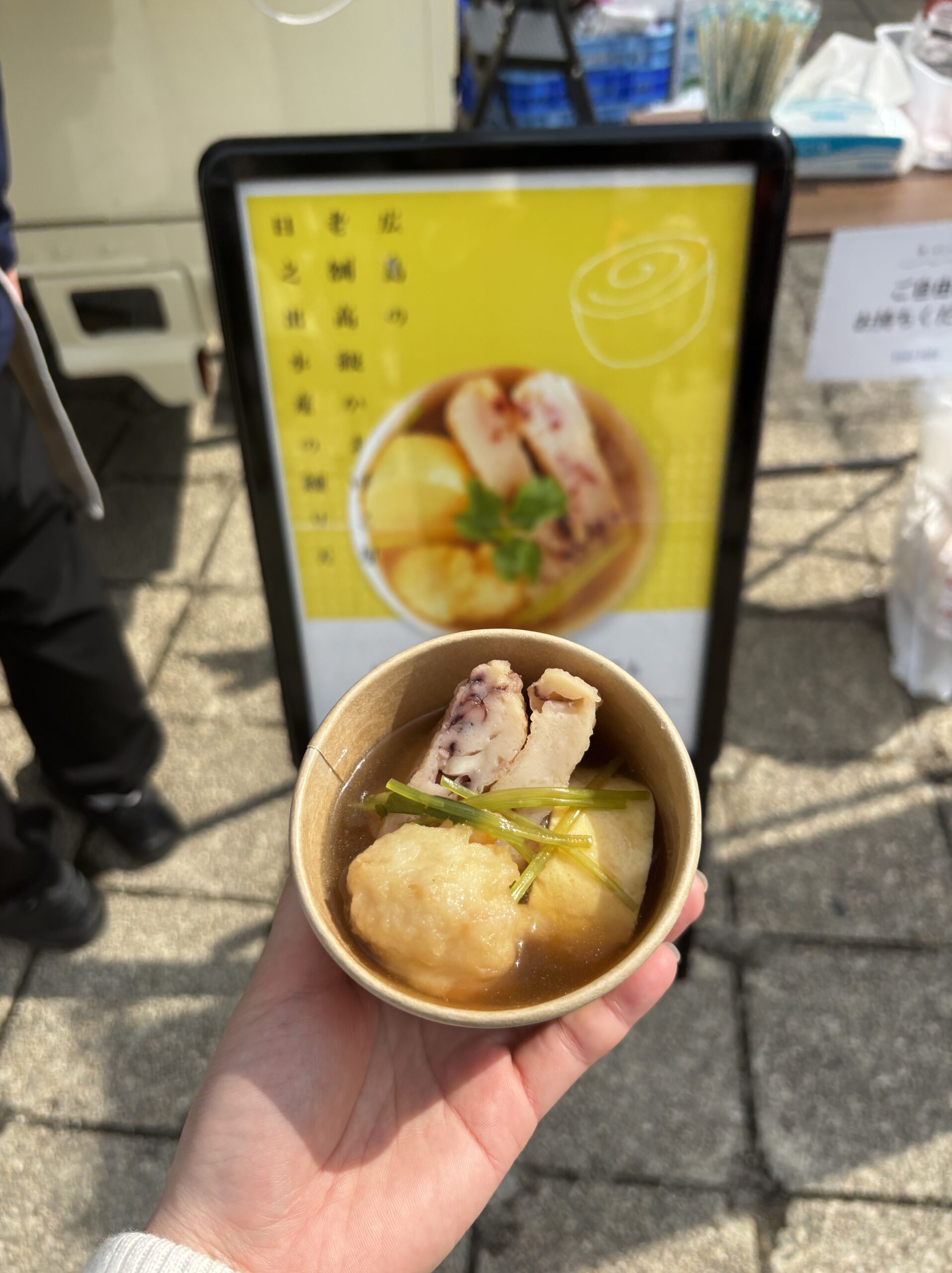 イカゲソと海老の練り天をおでんにして販売。